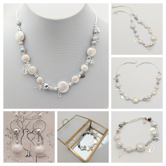 bracelet céramique blanche... Prix 84,00 € BO SERPENTINE BLANCHE Prix 32,00 € Ras-de-cou pastille blanche Prix 115,00 € BRACELET PERLE BLANCHE IRISE Prix 19,00 € BRACELET PASTILLE BLANCHE Prix 19,00 € un petit montage photos de modèle que vous pouvez associer, vous retrouverez les modèle sur mon site.